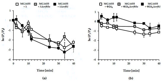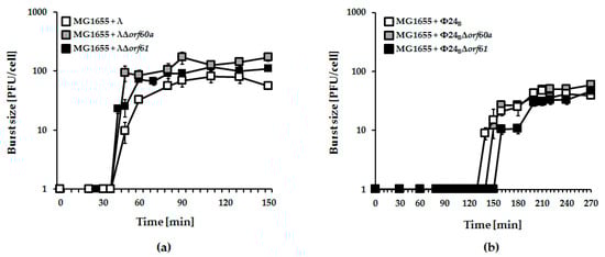 One-step growth experiments with λ (panel (a); white squares), Φ24B (panel (b); white squares), and recombinant phage mutants bearing deletions of orf60a (panels (a) and (b); grey squares) or orf61 (panels (a,b); black squares), infecting E. coli MG1655 host. Mean values from three independent experiments with error bars indicating S.D. are shown.
