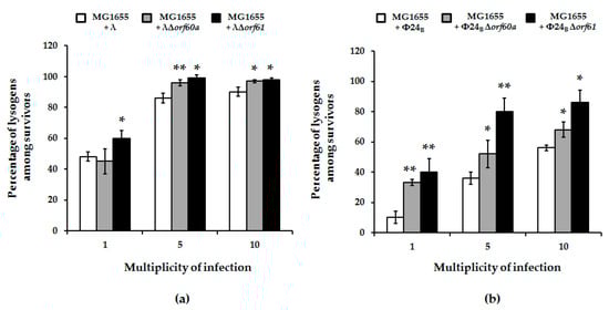 Fraction of lysogens among survivors of E. coli MG1655 bacteria after infection with wild-type bacteriophages: λ (panel (a); white columns) and Φ24B (panel (b); white columns) or their deletion mutants: λΔorf60a (panel (a); grey columns), λΔorf61 (panel (a); black columns), Φ24BΔorf60a (panel (b); grey columns), and Φ24BΔorf61 (panel (b); black columns). Results are presented as mean values ± S.D. from three independent experiments. A t-test was performed for results from each m.o.i. Statistically significant differences between wild-type phage and its deletion mutants are marked by asterisks, p < 0.05 (*) or p < 0.01 (**).