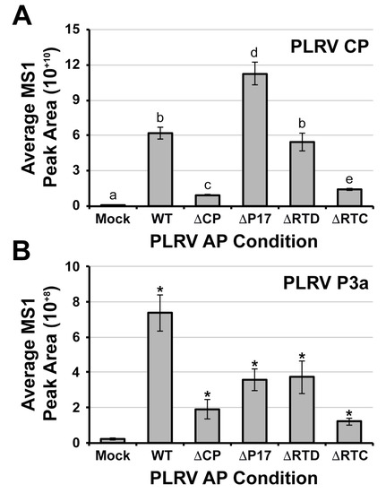 Label-free quantification of PLRV coat protein domain (CP) and P3a in α-PLRV affinity purifications (AP) from leaf tissue infected with WT or PLRV mutants. Bar graphs show the average relative protein abundance of (A) CP and (B) P3a quantified from the integration of MS1 (precursor ion) peak areas (unit-less) for protein specific peptides detected in AP samples from each of the PLRV infection conditions (n = 6 analytical replicates representing three biological replicates). The level of background noise in mock-infected tissue is shown. The number of peptides used for the quantification of protein abundance are CP = 10 and P3a = 2 (Supplemental Table S1). Error bars represent ± the average standard error. Lowercase letters represent significant differences (p < 0.05) measured by (A) Kruskal-Wallis rank sum test followed by a Conover post-hoc pairwise multiple comparison, which was further adjusted by the Holm FWER method and (B) by two-tailed, Wilcoxon signed-rank sum test compared to the mock-infected control where * p < 0.05.