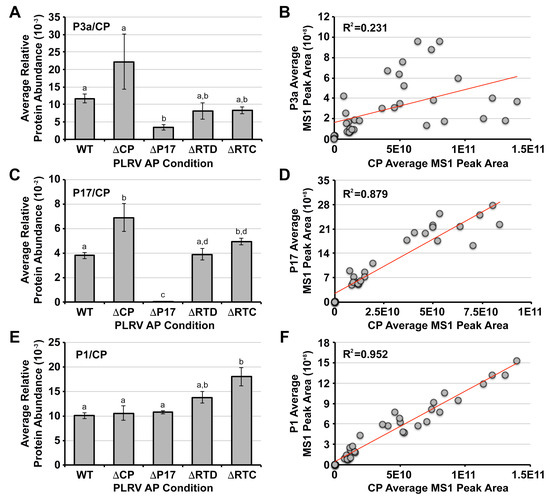 Comparative analysis of WT and mutant PLRV affinity purifications (AP) shows partial loss of P3a when P17 is absent. (A,C,E) Bar graphs show the average, relative protein abundance measured by MS1 peak area integration (unit-less) of (A) P3a, (C) P17 movement protein, and (E) P1 polyprotein in AP samples for each of the PLRV infection conditions normalized to the levels of the PLRV coat protein domain (CP) in those same samples. Error bars represent the ± standard error. Lowercase letters represent a significant difference (p < 0.05) measured by a Kruskal-Wallis rank sum test followed by a Conover post-hoc pairwise multiple comparison, which was further adjusted by the Holm FWER method; (B,D,F) Linear regression analysis between the average, relative levels of CP, and (B) P3a, (D) P17, and (F) P1 measured by MS1 peak area integration in each of the analytical AP replicates per PLRV infection condition. The coefficient of determination (R2) is given for each regression line (red). Values for P17 and CP in the ΔP17 null-mutant APs were not included in panel (D) since P17 was not detected above background noise in these samples (see panel C). The number of peptides used for MS1 peak area integration are: CP = 10, P3a = 2, P17 = 2, and P1 = 4 (Supplemental Table S1).