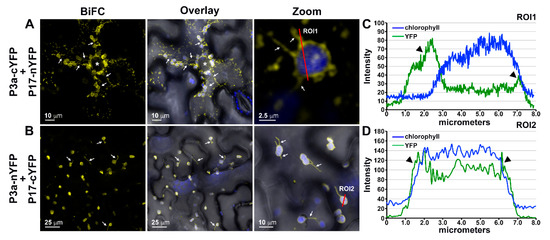 Using the same C-terminally tagged BiFC constructs and parameters described above, we tested the ability of PLRV P3a to directly interact with P17. In N. benthamiana leaf epidermal cells co-expressing P3a fused to the C-terminal half of YFP (cYFP = 9.1 kDa) and P17 to the N-terminal half (nYFP = 17.9 kDa), YFP fluorescence was observed as highly mobile, amorphous spots in the cytoplasm (Figure 4A, movie not shown) similar to the N-terminally tagged P3a homodimer (Figure 3B). Additionally, YFP co-localized with chloroplast autofluorescence (Figure 4A [PCC = 0.509 ± 0.049, tMYFP = 0.931 ± 0.033, tMchlor = 0.945 ± 0.018]) and to stromules [47] (white arrows, Figure 4). When the larger, N-terminal half of split YFP was fused to P3a and co-expressed with P17-cYFP, YFP fluorescence was only observed co-localizing with chloroplast autofluorescence and to plastid stromules (Figure 4B [PCC = 0.788 ± 0.014, tMYFP = 0.968 ± 0.013, tMchlor = 0.974 ± 0.009]). Quantification of fluorescence intensities across individual plastid bodies marked in Figure 4A,B indicated that, as chloroplast autofluorescence from the interior thylakoid membranes decreases at the plastid border, YFP fluorescence was still detected beyond the border especially within the stromule projections (black arrowheads, Figure 4C,D), which suggests localization of P3a-P17 complexes along or within the outer membrane of chloroplasts. These results are in-line with previous ultrastructural studies, which show that PLRV P17 can be detected on the periphery of companion cell chloroplasts in the context of a natural, systemic infection [48]. Unlike the P17 BiFC homodimer (Figure 3C), YFP fluorescence from the P3a-P17 heterodimer interaction was never observed within the nucleus or cell wall (Figure 4A,B). These results suggest that P17 can only localize to the nucleus and the cell wall as a homodimer or that irreversible association with P3a due to BiFC prohibits P17 from trafficking to these sites.