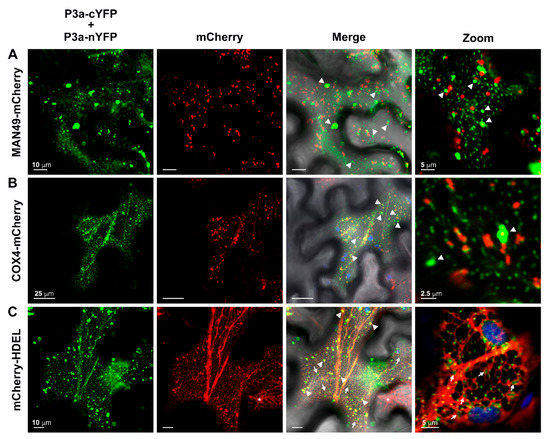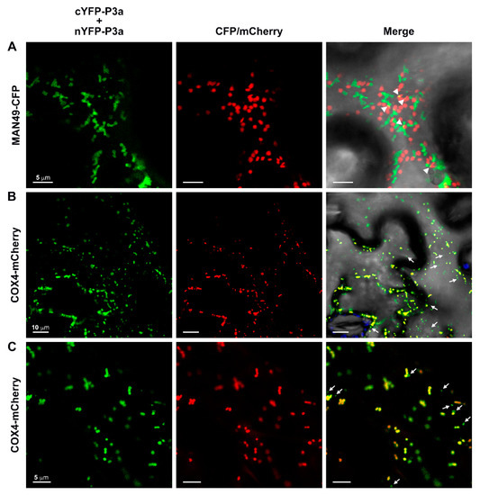 To identify the subcellular location of the punctate spots observed for the N-terminally tagged P3a BiFC homodimer (Figure 3B) and P3a-cYFP/P17-nYFP heterodimer (Figure 4A), BiFC constructs were co-expressed with fluorescent organelle markers [40,41] in N. benthamiana leaves. In contrast to data published for TuYV and BrYV [19,26], widespread co-localization of the YFP signal generated from cYFP-P3a/nYFP-P3a BiFC with MAN49-CFP, a cis-Golgi marker [49] was not observed (Figure 5A). Yet, time-lapse analysis did show transient overlap between cis-Golgi and the cYFP-P3a/nYFP-P3a BiFC indicating that these two compartments can briefly come in contact (Figure 5A, white arrowheads and Movie S7). We did, however, observe significant co-localization of the cYFP-P3a/nYFP-P3a homodimer (Figure 5B,C [PCC = 0.866 ± 0.021, tMYFP = 0.973 ± 0.008, tMmCherry = 0.954 ± 0.008] and the P3a-cYFP/P17-nYFP heterodimer (Figure S6) with the inner mitochondrial membrane marker, COX4-mCherry, [41]. Interestingly, some of the YFP signal localized to smaller, “vesicle-like” structures, which were devoid of COX4-mCherry (Figure 5B,C, white arrows).