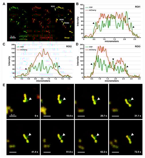 The quantification of fluorescence intensities across individual mitochondria marked in Figure 6A shows that YFP fluorescence from cYFP-P3a/nYFP-P3a BiFC extended beyond the mitochondrial border marked by the sharp decrease in COX4-mCherry fluorescence (Figure 6B,C, black arrowheads). In the time series presented in Figure 6E (Movie S8), the YFP signal from the N-terminally-tagged P3a homodimer was observed protruding from the body of a mitochondrion marked by COX4-mCherry fluorescence at time point zero. Over time, this protrusion disassociated to form a vesicle (Figure 6E, 31.1s), which re-associated with the mitochondria ~10 s later and proceeded to move up to the tip of the organelle (Figure 6E, 41.4–72.5s). These results demonstrate that some of the YFP-only structures shown in Figure 5A,B (white arrows) and Movie S8 originated from the mitochondrial outer membrane, which is reminiscent of the matrix-free, mitochondrial-derived vesicles (MDVs) that have been observed in plants and animals [50].