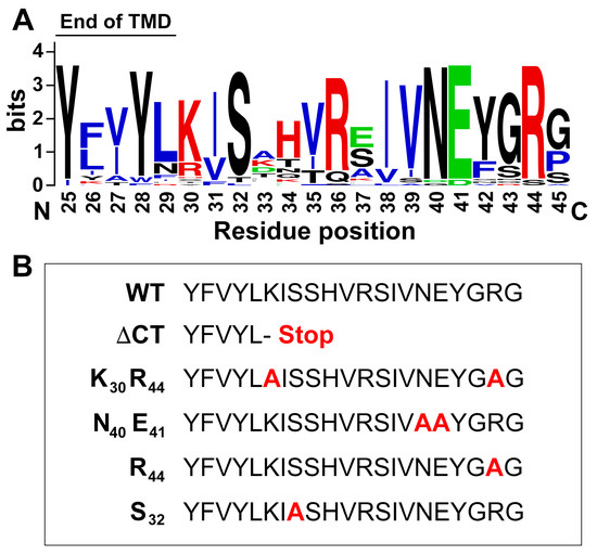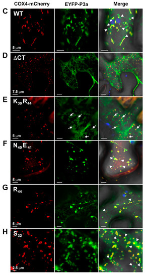 Since mitochondrial localization of P3a was only observed when the C-terminus of the viral protein was unhindered by a bulky tag, we hypothesized that a domain in this region may be important for an association with this organelle. The alignment of P3a protein sequences across 34 distinct luteovirid species (poleroviruses and luteoviruses) identified several highly conserved residues in the C-terminus of P3a immediately downstream of the predicted transmembrane domain (Figure 9A). These include three basic residues (lysine, K and arginine, R) at positions 30, 36, and 44 in PLRV P3a, a conserved serine (S) residue at position 32, and two polar residues (asparagine, N and glutamic acid, E) at positions 40 and 41. It has been shown that positively charged residues downstream of hydrophobic domains within membrane-bound proteins promotes their insertion into biological membranes [54]. This peptide region in PLRV P3a has an estimated isoelectric point of pH 10.4 with a net charge of 2.1 at pH 7.0 (https://pepcalc.com/). In order to investigate the role of this C-terminal region in directing the subcellular localization of PLRV P3a, site-directed mutagenesis was used to generate an EYFP-P3a construct deleting the last sixteen residues of P3a immediately downstream of the transmembrane domain and four additional constructs where alanine was substituted for the conserved residues described above either separately or in combination (Figure 9B). These constructs were individually co-expressed in N. benthamiana epidermal cells with COX4-mCherry and their localization analyzed by CLSM (Figure 9C–H). Compared to WT EYFP-P3a, which strongly co-localized with COX4-mCherry-labelled mitochondria and to matrix-free MDVs (Figure 9C), truncation of the C-terminus of P3a (ΔCT) abolished co-localization of the fusion protein with COX4-mCherry but not ER localization (Figure 9D). Double substitution of two of the three conserved basic residues in the P3a C-terminus, K30 and R44 (which lowers the isoelectric point of this region to pH 7.8), also abolished co-localization of EYFP-P3a within COX4-mCherry-labeled mitochondria (Figure 9E). Although, YFP-fluorescent ring structures associated with the ER could be observed surrounding the mitochondria (Figure 9E, white arrows). Substitutions of residues N40 and E41, R44 alone, or S32 had no effect on the localization of the EYFP-P3a fusion protein to mitochondria or MVDs (Figure 9F–H). These data further support our BiFC experiments showing that the C-terminus of PLRV P3a, either in conjunction with the predicted N-terminal transmembrane domain or independently, regulates the trafficking of this viral protein to mitochondria.