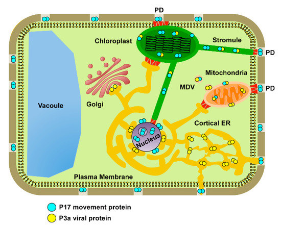 Hypothetical model for the intracellular trafficking of two non-structural viral proteins that regulate long-distance movement of PLRV in plants. Based on imaging results obtained from bimolecular complementation assays coupled to co-localization with fluorescent protein-based organelle markers, P17 (blue circles) and P3a (yellow circles) homo/heterodimer complexes localized to the outer membranes of mitochondria and plastids may traffic to and from plasmodesmata (PD) through plastid stromules, mitochondrial-derived vesicles (MDV), or membrane contact sites (red triangles) established between the cortical endoplasmic reticulum (ER) and other organelles. However, only the P17 movement protein has the ability to permanently associate with PD and the nucleus.