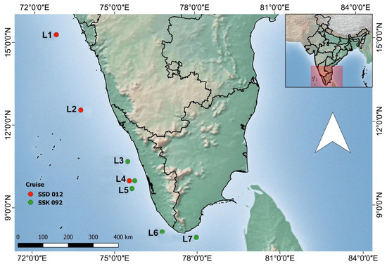 Water samples were collected during two oceanographic cruises onboard RV Sindhu Sadhana in 2015 and RV Sindhu Sankalp in 2016 during the southwest monsoon season (Figure 1). The cruises targeted the OMZs in the southeastern Arabian Sea, which extends from 100 m to 1000 m depth. The study area extended from 7.9° N–15.3° N to 72.8° E–77.97° E (Table 1). Samples were collected from three locations in 2015 and from five locations in 2016 (Table 1). Locations L1, L2, and L4 were sampled during 2015 and L3, L4, L5, L6, and L7 during 2016 (Figure 1). The depth of the stations ranged from 200 m to 400 m (L2: 400 m, L1, L3–L7: 200 m).