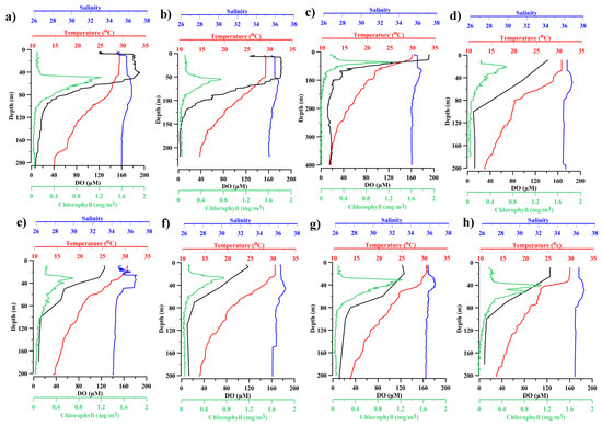 Vertical water column profiles of temperature, salinity, dissolved oxygen and Chlorophyll a concentrations at (a) L1 (b) L2 (c) L4 in 2015 (d) L3 (e) L4 in 2016 (f) L5, (g) L6, and (h) L7.