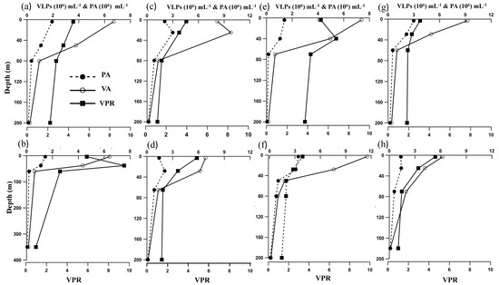 Vertical distribution of viral abundance (VA), prokaryotic abundance (PA) and virus to prokaryote ratio (VPR) at stations (a) L1; (b) L2; (c) L4 in 2015; (d) L3; (e) L4 in 2016; (f) L5; (g) L6; and (h) L7.