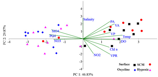 Potential relationships among biological and environmental variables were tested by linear pairwise correlations (e.g., Pearsons correlation analysis). Principal Component or Coordinate Analysis (PCA) was carried out while using PAST software version 3.0 [41] to understand the relationship between the biotic and abiotic variables. The data was normalised by x-mean/standard deviation. Significant differences in various biotic and abiotic variables in oxic, oxycline and hypoxic waters were tested by one-way analysis of variance (ANOVA) while using PAST software. Non-parametric distance-based linear regression (DistLM) analysis was performed while using Primer 7 software, to determine the relative importance of predictor variables [42].