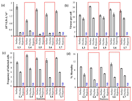 Represents the (a) Viral lytic production (109 VLPs L−1·d−1) (b) Burst size (numbers per cell), (c) Frequency of infected cells (% IC), and (d) viral induced prokaryotic mortality (%) at various oxygen concentrations, surface, SCM, oxycline, and hypoxic layers at stations L3, L4, L5, L6, and L7. ND: Not detected.