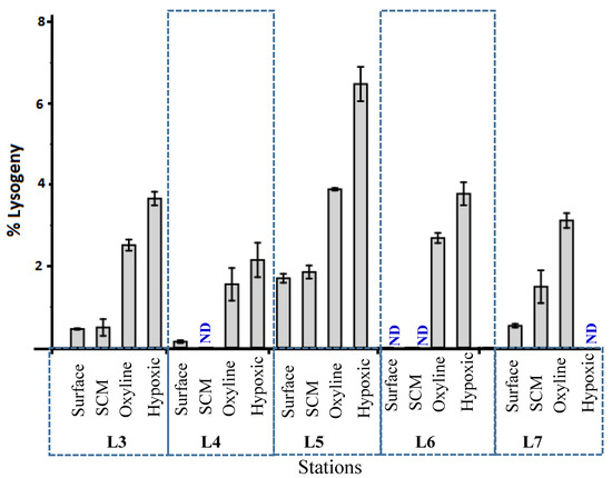 Overall, in this study, the percentage of lysogeny determined by using an inducing agent, mitomycin C, ranged from undetectable to 48% (Figure 6). Lysogeny was undetectable to 1.7% in oxic waters, whereas it was higher in oxycline (9–24%) and maximum in the hypoxic to suboxic waters (24–48%). We report the existence of contrasting pattern in viral reproductive strategy, which is significantly correlated to dissolved oxygen concentrations. Our finding agrees with the notion that lysogeny is a survival and maintenance strategy for viral populations that are threatened by harsh nutrient/host conditions and therefore, cannot sustain population numbers through lytic infection alone [61]. Lysogenic adaptation provides a refuge for viruses inside the prokaryotic cell. Lysogeny can favour transfer of viral genes between hosts by transduction [54]. Knowledge on biotic and abiotic factors in oxygen-limited environments that set the lysogeny-to-lytic switch will definitely shed new light on the role of temperate viruses in the microbial food web and energy transfer to higher trophic levels [62].