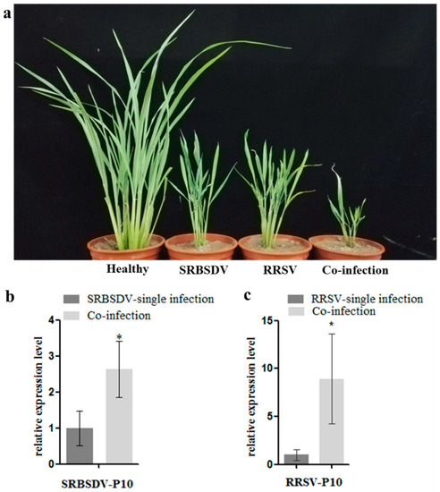 Co-infection of SRBSDV and RRSV exacerbates the symptoms (a) and increases the accumulation of the two viruses in rice plants (b,c). (a). Co-infection of SRBSDV and RRSV exacerbates symptoms (left to right: Healthy:Healthy rice plant; SRBSDV:SRBSDV singly infected plant, RRSV:RRSV singly infected plant; Co-infection: SRBSDV + RRSV); (b). Co-infection of SRBSDV and RRSV increased the accumulation of SRBSDV P10 mRNA; (c). Co-infection of SRBSDV and RRSV increased the accumulation of RRSV P10 mRNA (Asterisk indicates significant differences (p < 0.05)).