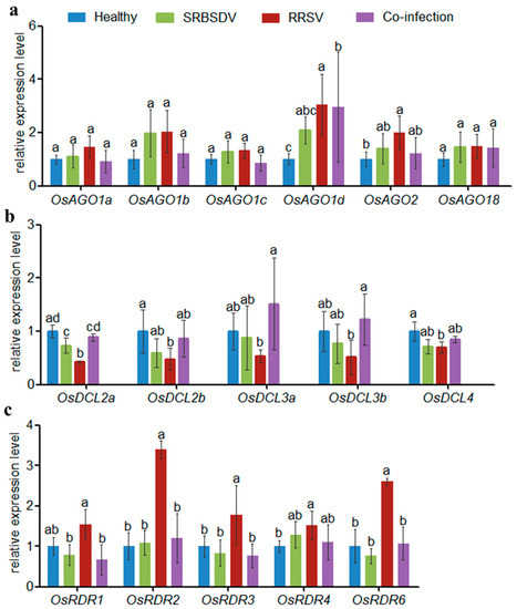 The results showed that AGOs were mostly up-regulated whether in SRBSDV singly infected plants, RRSV singly infected plants, or doubly infected plants compared with healthy plants (Figure 2a). However, in doubly infected plants, only the expression levels of AGO1d showed significant difference with that in SRBSDV singly infected plants, by up-regulated 42.38%. Other AGOs showed no significant difference between singly and doubly infected plants, although the expression levels of AGO1a, AGO1b, AGO1c, AGO2 were down-regulated slightly in doubly infected plants compared with that in singly infected plants (Figure 2a).