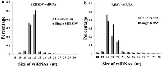 Size distribution of SRBSDV-derived small RNAs (a) and RRSV-derived small RNAs (b). (a) Size distribution of SRBSDV-vsiRNAs infected with SRBSDV or co-infected (SRBSDV + RRSV). (b) Size distribution of RRSV-vsiRNAs infected with RRSV or co-infected (SRBSDV + RRSV).
