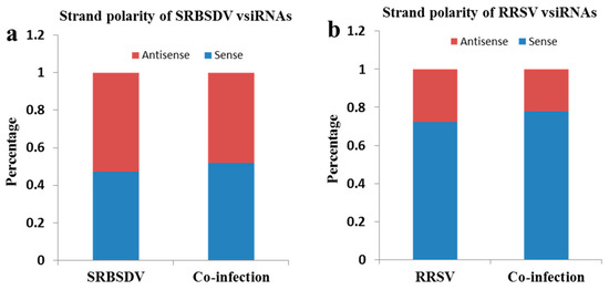 To understand the origin of the vsiRNAs, the strand polarities of vsiRNAs were analyzed (Figure 4). There were no obvious differences in strand polarity for SRBSDV-vsiRNAs, either in SRBSDV singly infected or in doubly infected plants (Figure 4a), but a high prevalence of the sense (+) strand was observed in RRSV singly infected and doubly infected plants (Figure 4b). Despite the difference in the strand polarity of vsiRNAs between SRBSDV-vsiRNAs and RRSV-vsiRNAs, co-infection had no effect on the strand polarity for SRBSDV-vsiRNAs or RRSV-vsiRNAs.