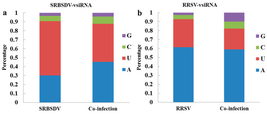 The proportions of 5′ terminal nucleotides of SRBSDV-derived vsiRNAs (a) and of 5′ terminal nucleotides of RRSV-derived vsiRNAs (b). (a) 5′-terminal nucleotides of SRBSDV-vsiRNAs in plants infected with SRBSDV or SRBSDV + RRSV. (b) 5′-terminal nucleotides of RRSV-vsiRNAs in plants infected with RRSV or SRBSDV + RRSV.