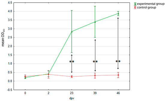 Detection of PiCV rCP–specific IgY in sera of the examined pigeons using in-house ELISA. The pigeons were immunized with PiCV rCP mixed with adjuvant (experimental group, E) or adjuvant only (control group, C) on day 0 and boosted on day 21. Serum samples were collected from birds of both studied groups on days 0, 2, 23, 39, and 46 after first immunization (dpv). The asterisks indicates a statistically significant difference between the investigated groups at p < 0.01 in U Mann-Whitney non-parametric test. Error bars represent the standard error of the mean.