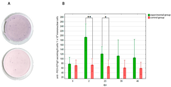 (A) Comparison of two representative samples of PiCV rCP immunized pigeons (upper) and control pigeons (lower). Numerous SFU were noted in the samples from pigeons of both groups; nevertheless, in the control group birds the SFU number was constant throughout the experiment, and it was treated as a background. (B) The results of ELISPOT for anti-PiCV rCP IgY–SBC in the spleens of the investigated pigeons. The pigeons were immunized with PiCV rCP mixed with adjuvant (experimental group, E) or adjuvant only (control group, C) on day 0 and boosted on day 21. Spleen samples were collected from birds of both studied groups on days 0, 2, 23, 39, and 46 after first immunization (dpv). The asterisks indicates a statistically significant difference between the investigated groups, where * p < 0.05, ** p < 0.01 in U Mann-Whitney non-parametric test. Error bars represent the standard error of the mean.