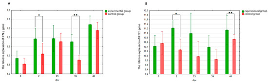 Mean relative expression of the genes encoding IFN-γ in blood (A) and splenic (B) mononuclear cells of pigeons immunized with PiCV rCP mixed with adjuvant (experimental group, E) or adjuvant only (control group, C) on day 0 and boosted on day 21. Samples were collected from pigeons of both studied groups on days 0, 2, 23, 39, and 46 after first immunization (dpv). The asterisks indicate a statistically significant difference between investigated groups, where * p < 0.05, ** p < 0.01 in U Mann-Whitney non-parametric test. Error bars represent the standard error of the mean.