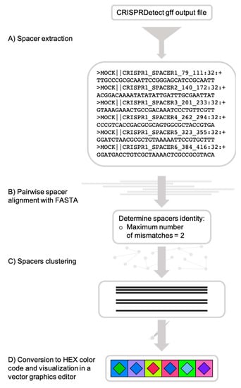 Usually, CRISPR typing analyses begin by comparing the spacer content (number of spacers and nucleotide sequences) of different bacterial isolates to organize and cluster them based on their spacer content similarity. Then, for reporting purposes, the CRISPR arrays are graphically represented with colored shapes, making it easy to visualize similarities and differences across microbial strains. Although this representation is now commonly used to facilitate comparison and analyses [17,18,19,20,21,22,23,24,25,26,27,28,29], the development of software to support such analyses remained unexplored until recently when the first automated visualization program, called CRISPRviz, was published [30]. This program is a web-based visualization tool that allows rapid conversion of nucleotide sequences to colored shapes, for more intuitive strain comparison. Although CRISPRviz alleviates considerably the repetitive nature of visualizing spacers with colored shapes, it has some limitations. First, CRISPRviz relies on minCED [31] for spacer and repeat extraction and while it is a rapid program for CRISPR identification, it does not recognize the array orientation. As such, the user must manually verify the reverse complement sequence in the output interface, which may become tedious in large-scale studies. Second, the system for color-coding spacers, which consists of transforming nucleotides to integers and then to a RGB (red, green, blue) value, causes nearly identical spacers to be represented by completely different colors. This may be relevant in some bacterial species, where a single nucleotide difference between a spacer sequence and its protospacer equivalent in the phage genome can alter the cell’s resistance [32]. In other bacterial species however, for example E. coli, it has been shown that the nucleotide sequence matching requirement for a spacer to efficiently block phage infection and cleave nucleic acids, also known as the seed region, is much shorter [33,34]. Hence, nucleotide sequence comparisons of spacers should be tailored to their biological context and allow a customizable number of mismatches.