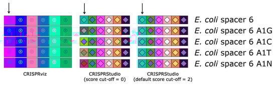 Since new spacers are mostly added at the 5′-end of the CRISPR array during the viral adaptation stage, while spacer deletion has been reported to occur in the internal part of the CRISPR array, it is commonly accepted that the most ancient and conserved spacers are found at the 3′-end of the array [12,38]. By aligning CRISPR loci on the right (in the 5′–3′ orientation), spacers at the 3′-end, which are more likely to be shared among microbial strains of the dataset, will also share their vertical position, making similar spacers between samples easy to identify. Another improvement with our proposed color-coding method is the versatility it offers for comparing spacers. By default, two spacers will have the same color if their pairwise alignment shows at most 2 mismatches. This value can be modified by adding an optional argument when executing the program, so that spacer comparison becomes more stringent (score cut-off = 0) or more permissive (score cut-off > 2). This adjustment is not available with CRISPRviz, since the color-coding system consists of transforming nucleotide sequences to integers with a formula that does not allow different degrees of stringency. To illustrate this improvement, we compared the CRISPRviz output with that of our current program using the CRISPR 1 array from E. coli strain K12 (Figure 2). We modified the nucleotide on the first position of the sixth spacer of the array (A to G, C, T or N). With CRISPRviz, the degree of change in color varies according to the change in nucleotide: when A becomes N, the color looks more similar compared to when A becomes G. With CRISPRStudio, the colors either change completely with a score cut-off of 0 or remain the same with the default value of 2.