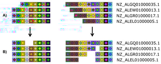 Versatility offered by CRISPRStudio. Vector graphics output allows for easy manual editing. Here, four Salmonella strains are displayed with their two CRISPR loci split in two columns. White spaces were added to the original figure (A) so that homologous spacers are vertically aligned (B).