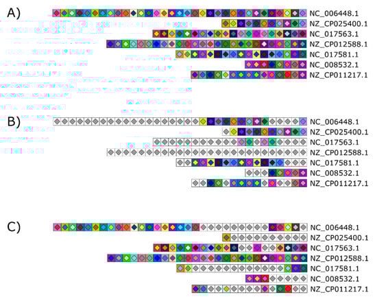 Optional graying out to easily mark similar and unique spacers across and within samples. (A) The CRISPR 1 loci of seven S. thermophilus strains were used to illustrate this feature. Two options are available: (B) Unique spacers present only once in the figure are grayed out to highlight similar spacers across the dataset or (C) similar spacers are grayed out to highlight unique colored spacers. Grayed out spacers all bear the same symbol consisting of a white square with a light gray diamond.