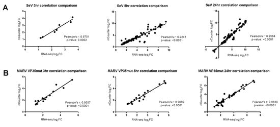 The correlation comparison between nCounter and RNA-seq. DEGs (differentially expressed genes) common to both the transcriptomic platform datasets were graphed against each other. RNA-seq log2FC (fold change) are shown on the x-axis and nCounter log2FC are shown on the y-axis. Pearson’s correlation analysis was performed to determine the relationships between datasets. The line represents the regression analysis. MARV WT correlation comparison is not shown because the two platforms shared no more than one DEG in common. (A) SeV comparison is shown for all three time points. (B) MARV VP35mut comparison is shown for all three time points.