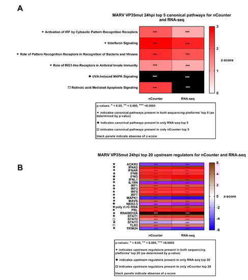 To determine the biological significance of DEGs obtained by each platform, we used the Ingenuity Pathway Analysis (IPA), which ranked enriched canonical pathways and predicted upstream regulators. IPA gives an activation score (positive or negative z-score) that indicates whether a pathway is up- or down-regulated or an upstream regulator is predicted to be activated or deactivated, respectively. SeV at all three time points resulted in a strong upregulation of canonical innate immune pathways, and the top 20 predicted upstream regulators were consistent with those expected for a robust immune response activator (Figures S2 and S3A). However, no relevant antiviral signaling-related pathways were identified for any MARV WT DEGs. Together, our data suggest that MARV WT infection of RoNi cells dramatically suppresses antiviral response gene activation, similar to what has been previously reported for primate cells.