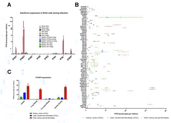 Along with the potential expansion of critical response genes, we found that the baseline expression of many others was naturally elevated in uninfected RoNi cells compared to analogous human cell types (Figure 5B). This was assessed by comparing expression data from the GTEx project database of kidney-cortex cells (45 total datasets) and a transformed fibroblast cell line (343 total datasets) to our mock RoNi dataset. Several RoNi genes with significantly higher basal levels were response regulators or signaling factors, including ISG15, ISG20, RNASEL, IFIT5, IRF3, and IRF1 (Figure 5B). Other potentially important genes, such as TP53 and STAT3, were also elevated in RoNi cells. Contrary to previous reports for P. alecto cells, IFNA genes were not constitutively expressed in RoNi cells []. Instead, we found twice the expression of Type I IFN receptor IFNAR1, and dramatically higher levels of full-length (long) IFNAR2 as well as its soluble isoform, the most abundant IFNAR2 transcript. In contrast, these IFNAR2 variants showed little to no expression in human cells (Figure 5B,C).