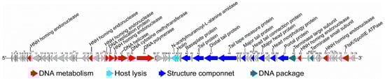 Schematic diagram of the genome of the phage vB_BthS_BMBphi. The functional classification of the genes in the phage vB_BthS_BMBphi genome are indicated in different colors and the transcription directions of the genes are also shown.