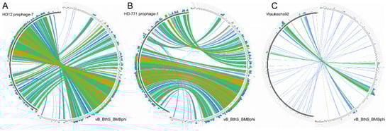 Comparative genomic analysis of phage vB_BthS_BMBphi. The genome sequences of phage vB_BthS_BMBphi, HD12 prophage-7 (A), HD-771 prophage-1 (B), and phage Waukesha92 (C), were compared and visualized by using Circoletto, and genome regions that exhibited similarity are shown in the same color. The degrees of similarities are also shown.