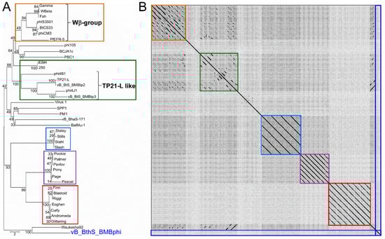 The genome of the phage vB_BthS_BMBphi was searched against the NR database in National Center for Biotechnology Information (NCBI) to find similar phages, and the result showed that only partial regions of the vB_BthS_BMBphi genome showed similarity with chromosome regions of the B. thuringiensis strains HD-771 (GenBank accession number NC_018500.1) and HD12 (GenBank accession number NC_CP014847.1), but not the other phage genomes. These two bacterial genome regions were predicted to be intact prophages by using PHAST [], which indicated that the phage might be derived from the prophages of B. thuringiensis (Figure S2). Furthermore, the regions that exhibited similarity with the prophage sequences were located in the middle of the phage genome, while no homologous genomic regions were found to have similarity with the terminus of the vB_BthS_BMBphi genome, indicating that the phage has undergone genome recombination during the evolutionary process. The genes in the structure module of the phage genome showed higher similarities with genes in the bacterial genome than the genes in the DNA metabolism module. Although the DNA metabolism genome module and the structural module in the phage vB_BthS_BMBphi genome showed a collinearity relationship with the prophages, the whole genome of the phage vB_BthS_BMBphi exhibited a rearranged genome structure compared to that of the prophage, with the reversion of the two modules, which might have occurred during the lytic conversion of the prophage or the lysogeny conversion of the phage (Figure 3). Phylogenetic analysis of the Siphoviridae family phages infecting Bacillus genus strains revealed that phage vB_BthS_BMBphi was only close with Waukesha92 in terms of evolution and distant in evolution to the other Bacillus phages (Figure 4A). Comparative genomic analysis of the phages vB_BthS_BMBphi and Waukesha92 revealed that although these two phages showed a close relationship in the phylogenetic tree, they only maintained a few similar genome regions (Figure 3C). The integral similarity between these two phages was analyzed by using BLASTn and the result showed that they only showed extremely low similarity. The pairwise proteomic comparation of these Bacillus phages also showed that there was no collinearity relationship between the phage vB_BthS_BMBphi and the other Bacillus phages (Figure S3). The comparative genomic and proteomic analysis of the phage vB_BthS_BMBphi indicates that the phage vB_BthS_BMBphi might be representative of a novel phage lineage.