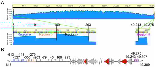 The phages might harbor a repeated genome terminal structure to protect their genomes []. For the purpose of identifying the terminus of the phage genome, the reads acquired by genome sequencing were mapped onto the phage genome by using Geneious R11. The result showed that the reads that were mapped to the phage genome termini were more than those mapped to the nearby regions (Figure 5A). The 5′-terminus of the phage vB_BthS_BMBphi genome, which can be divided into three regions, contained two more repeats of region α (120 bp-length), one more repeat of region β (77 bp-length), and three more repeats of region γ (125 bp-length), indicating that the terminus of the phage genome might contain, in total, three repeats of region α, two repeats of region β, and four repeats of region γ (Figure 5B). At the 3′-terminus of the phage genome, one more repeat of region σ was found, suggesting the 3′-terminus of the phage genome contain two repeats of region σ, in total. In consideration of the repeated regions in the phage genome termini, the total length of the phage genome might be 49,921 bp. Functional analysis of the repeated regions showed that these regions do not contain functional protein-encoding genes. The repeated regions were also confirmed by primer-walking and Sanger sequencing and the result was identical with respect to the repeat number of the terminal repeated regions.