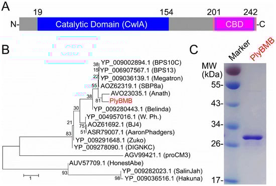 The endolysin exhibits high potential for being used in the control of pathogenic bacteria, due to its ability to lyse the bacterial cell wall [,,]. Bioinformatic analysis of the phage vB_BthS_BMBphi genome revealed that the gene gp41 was annotated to encode an endolysin and gp42 was annotated to encode a holin, which can facilitate the access of endolysin to the cell wall by forming holes in the cell membrane []. The phage vB_BthS_BMBphi isolated in this study showed high lytic activity against the host bacteria, suggesting the phage might encode an endolysin with high lytic activity. The bioinformatic analysis of the endolysin (GP41, designated as PlyBMB) showed that the protein contained a N-terminal catalytic domain and a C-terminal cell wall-binding domain (Figure 6A). The Bacillus phages encoding endolysins that exhibited more than 50% similarity with PlyBMB was used for constructing a phylogenetic tree. The result showed that the function of all the endolysins used for phylogenetic tree analysis have not been analyzed, indicating that the endolysin analyzed in this study was a novel endolysin (Figure 6B). The alignment of the amino acid sequences of the endolysins used for phylogenetic analysis showed that all these endolysins showed highly conserved sequences, with four residues conserved in all the analyzed endolysins, which might be essential for the function of the endolysins (Figure S4). The endolysin encoded by the Bacillus phage Anath (GenBank accession number MG983742.1) showed the closest relationship with PlyBMB in terms of evolution, while the phage vB_BthS_BMBphi exhibited no similarity with the phage Anath. The endolysin PlyBMB has a molecular weight of 27 kDa and is easily prepared in a soluble form (Figure 6C).