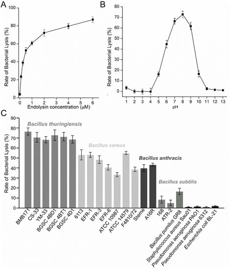 Lytic activity analysis of the endolysin PlyBMB. (A) The influence of concentration on the lytic activity of PlyBMB. (B) The influence of pH on the lytic activity of PlyBMB. The B. thuringiensis strain BMB171 was used for the optimal pH test. (C) Lytic spectrum of PlyBMB.