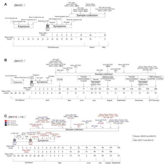 Timelines of ZIKV exposure, symptoms and sample collection in the four subjects enrolled in the present study. Periods of exposure, symptom onset, serology and molecular detection results of ZIKV in the followed subjects are described as: (A) case 1—female (ZIKV01), (B) case 2—male (ZIKV17), (C) case 3—female (ZIKV18) and case 4—male (ZIKV19). Day 0 denotes the onset of symptoms.