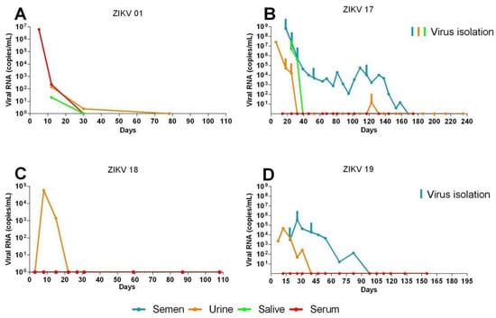 In the two females (ZIKV01 and ZIKV18) the ZIKA RNA was detected by qRT-PCR in urine, serum and saliva. ZIKV01 was the only patient in this study that developed viremia, which was detected at day 5 (6.2 × 107 genome equivalents (ge)/mL) and lasted until day 12 (2.2 × 102 ge/mL). ZIKV RNA was also detected in her saliva at day 12 (2 × 102 ge/mL). Both patients had ZIKV RNA detected in urine samples from day 12 (102 ge/mL) through day 30 (20 ge/mL) for patient ZIKV01 and at day 8 (5.7 × 104 ge/mL) for patient ZIKV18 (Figure 2A,C).