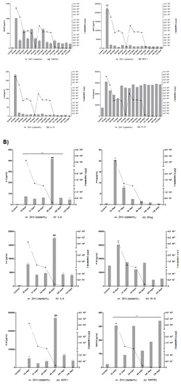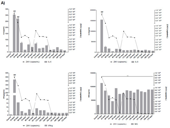 Concentration of cytokines, chemokines and RNA viral load determined on semen of patients ZIKV17 (A) and ZIKV19 (B). The levels of the following cytokines and chemokines were measured in blood and seminal plasma—IL-2, IL-4, IL-6, CXCL8 (IL-8), IL-10, IL-17, IFN-γ, TNF–α, CCL2 (MCP-1), CCL5 (RANTES), CXCL9 (MIG), CXCL10 (IP-10). The results are representative of two distinct experiments performed in duplicate. Values of p less them 0.05 were considered statistically significant (* p < 0.05; ** p < 0.001; *** p < 0.0001—concentration of cytokines/chemokines in ZIKV patients versus control (semen from Zika—uninfected individual), ### p < 0.0001 correlation of concentration of cytokine/chemokines in different days after symptoms onset). IL-2, IL-4, IL17A and TNF–α were not detected in the seminal plasma of both patients. No cytokines or chemokines were detected in serum of both patients—serum results were below the limit of detection of the kit (20 pg/mL for cytokines and 10 pg/mL for chemokines).