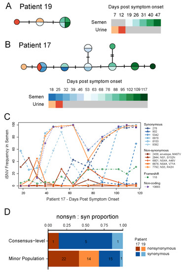 Evolution of ZIKV populations throughout the infection course. Median-joining haplotype networks constructed from full genome alignments of the consensus sequences from patients ZIKV19 (A) and ZIKV17 (B). Colors indicate sample type and collection date relative to symptoms onset. Each dash represents a single nucleotide substitution differentiating consensus sequences from different samples. (C) Intra host single nucleotide variant (iSNV) frequencies over time in semen samples collected from patient ZIKV17. The legend indicates the nucleotide position of each iSNV relative to KX197192.1 (GenBank) and for non-synonymous changes, the affected protein and amino acid change. Only positions with a minimum frequency ≥25% in at least one sample are shown. See Table S3 for details about these mutations and others present at lower frequencies. (D) Proportion of nonsynonymous and synonymous ZIKV iSNVs observed in semen samples from patients ZIKV17 and ZIKV19. The relative counts of nonsynonymous and synonymous variants observed above (consensus-level) and below 50% frequency (minor population) in at least one sample were significantly different (Fisher’s exact test p-value = 0.01).