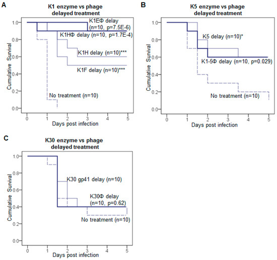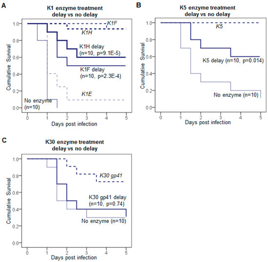 Delayed treatment is better than no treatment only for some enzymes. The delayed treatments of phage capsule depolymerases given 8 h after infection exhibited reduced efficacy (Figure 1). The delayed treatment with K1F or K1H enzyme resulted in 50–60% survival compared to zero survival in control (Figure 1A), while the simultaneous treatment led to 90–100% survival [11]. K1E did not rescue well in simultaneous treatment, thus the delayed treatment was not tested here. Delayed K5 enzyme treatment showed a 60% survival (Figure 1B) compared to 100% survival when treatment was immediate; both were significantly better than no-treatment controls. Delayed treatment with the least active enzyme K30 gp41 did not significantly improve survival (Figure 1C).