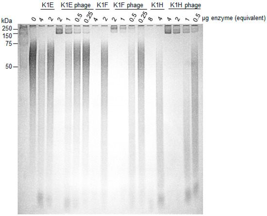 Capsules were isolated as previously described [11,40] for degradation assays monitored by gel electrophoresis and Alcian Blue staining. To compare activity of purified K1 enzyme to enzyme activity of intact phage, 10–20 μg K1 capsule was mixed with serial dilutions (0.25–8 μg) of K1E, K1F, K1H enzyme or CsCl-purified cognate phage at the calculated amount of enzyme equivalents at 37 °C for 1 h before gel electrophoresis. Enzyme equivalents of phages were calculated from the molecular weight of each enzyme [41,42] and the fact that these phages contain six depolymerase trimers and thus 18 enzyme molecules per phage particle [35]. 1010 phage would thus have ~3 × 10−2 μg enzyme (varying somewhat among different enzymes). This calculation assumes that phage stocks plate at a particle:plaque ratio of 1; a reduced efficiency of plating would underestimate the amount of enzyme in the phage sample.