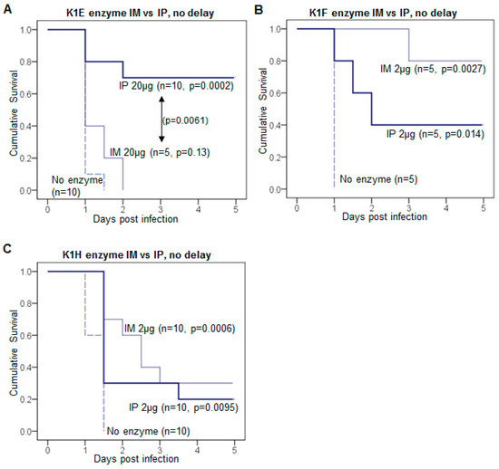 K1E enzyme rescued rat pups by IP inoculation [21,22] but was minimally effective in mice by IM inoculation [11]. It does not appear that our purified K1E enzyme is at fault—its in vitro activity approximately matches that of the other K1 enzymes (Figure 3). Motivated by suggestions that administration routes may affect drug bioavailability [43,44,45], we compared the efficacy of IM versus IP administration routes of the different K1 enzymes; these studies used immediate treatment.