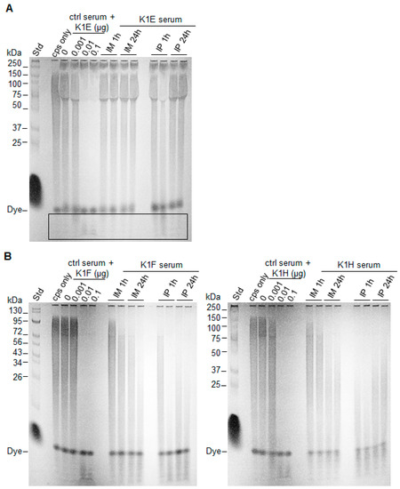 Comparison of depolymerase serum activity using different administration routes. Except for the molecular weight standard (“std”) on the left of each panel, each lane fractionates 10–20 ug of K1 capsule (“cps only”) or an overnight reaction of capsule incubated with serum and/or enzyme. Lanes with “serum” used serum from mice inoculated with enzyme (A) K1E; (B) K1F (left) or K1H (right) (IM or IP, 1 mg/kg weight) and sacrificed at 1 or 24 h. Two mice were tested for each route and time point, shown in separate lanes. Lanes with “ctrl serum” had different amounts of free enzyme added to the control serum (from mice not receiving enzyme injection), as the control reactions. Only a slight activity of K1E is evident, and then only for IP 1h (bottom of lane, boxed). In contrast, K1F and K1H both exhibit clear activity by both routes of administration, with a possible effect of route for K1H at 1 h.