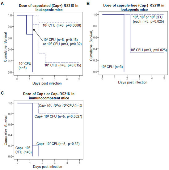 Capsule-free RS218 is avirulent in mice. Kaplan-Meier survival curves of mice per dose of different strains. (A) K1-capsulated RS218 (Cap+) in leukopenic mice; (B) capsule-free RS218 (Cap−) in leukopenic mice; (C) Cap+ and Cap− RS218 in immune competent mice. The median lethal dose is 103–104 CFU for Cap+ and 106–107 CFU for Cap- RS218 in leukopenic mice, a difference of 3 orders of magnitude. The median lethal dose in normal mice is 106–107 CFU for Cap+ RS218, while Cap− RS218 is not lethal at doses as high as 109 CFU. Mouse survival was monitored for 5 days and the cumulative probability of survival was plotted for each dose. The mouse number n of each treatment is labeled by each curve. Log rank test: p values are listed for lower doses compared to the highest dose of each strain.