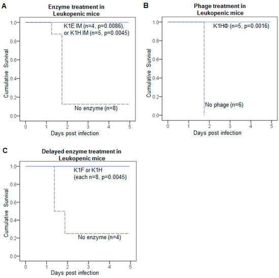 Enzymes and phages rescue infections of leukopenic mice. Total rescue of infections by K1 E. coli in leukopenic mice was achieved by simultaneous treatment with (A) K1E or K1H depolymerase; (B) K1H phage, and by delayed treatment with (C) K1F or K1H depolymerase. Each panel shows Kaplan-Meier survival curves with sample sizes given by n. Infection was initiated by intramuscular (IM) inoculations of 2.2–5.1 × 104 CFU of K1 E. coli in the left thigh. Treatment was an IM injection of 20 μg enzyme or 107 phage in the contralateral thigh. Treatment was administered either (A,B) immediately at the time of infection or (C) 8 h after infection. Mouse survival was monitored for 5 days and the cumulative probability of survival was plotted for each treatment. Log rank test: p values are listed for each treatment compared to no-treatment control.