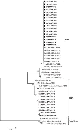 Phylogenetic analysis was possible by the recovery of 375 nucleotides from the partial sequencing of the E1 gene from representative CHIKV strains detected during the epidemics that occurred in RJ (n = 10) during 2016 [] and in AP (n = 17) during 2014–2015 (this study). Reference sequences available from GenBank were used representing the Asian, ECSA, and West African genotypes. After comparative analysis, the results showed that all strains from AP were grouped in the branch of the Asian genotype, while those from RJ clustered in the branch of the ECSA genotype, together with the sequence of a sample identified in Bahia in 2014 (Figure 1).