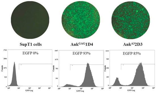 Establishment of SupT1 cells stably expressing AnkGAG1D4 and AnkA32D3 fused to an enhanced green fluorescent protein (EGFP) reporter protein. The EGFP reporter protein expression and the morphology of the cells were determined using an inverted fluorescence microscope at 200× magnification (top panel) at 48 h post-transduction. The percentages of EGFP-positive cells, which represent the SupT1 cells expressing AnkGAG1D4 and AnkA32D3, were investigated using flow cytometry (bottom panel).