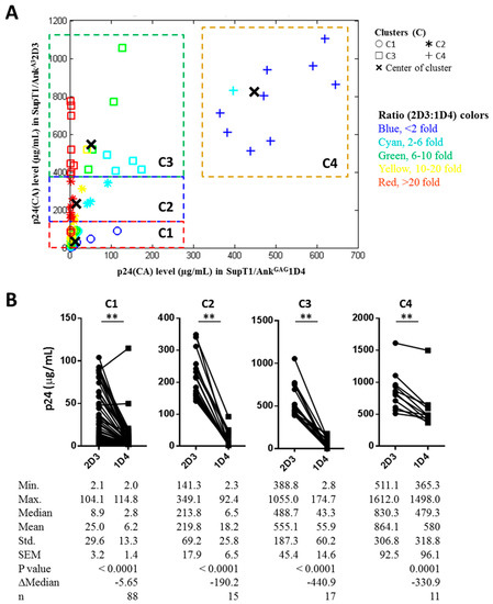 Quantitative analysis of the p24CA levels of the four clusters. (A) Four clusters, namely C1, C2, C3, and C4, were classified by the K-means clustering method. In the case of C4, a dataset in which the p24CA levels of SupT1/AnkGAG1D4 and SupT1/AnkA32D3 were over 1500 µg/mL was excluded from the plot. (B) The p24CA level of the four clusters after being classified by the K-means clustering method. Significant differences (** p < 0.01) in the p24CA levels between SupT1/AnkGAG1D4 and SupT1/AnkA32D3 were determined using the two-tailed Wilcoxon matched-pairs signed-rank test.