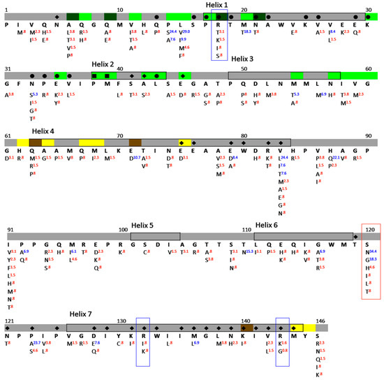 To analyse the NTDp24CA amino acid distribution on the AnkGAG1D4 binding pocket residues, the docking complexes from those previously reported of AnkGAG1D4 bound to helix 1 of NTDp24CA and helix 7 were utilised [25]. The sequence identity between the consensus amino acid and the p24CA structure in the docking complexes was 96.6%. Therefore, the AnkGAG1D4 binding pocket residues from those docking complexes could be applied in this study. In the case of the AnkGAG1D4 bound helix 1 of NTDp24CA, the AnkGAG1D4 binding pockets (18 residues) showed 17 (94.4%) highly conserved residues, as shown in by bullets in Figure 5. AnkGAG1D4 bound to helix 1 interacted with only one polymeric residue of NTDp24CA in the binding interface in <5 Å at positions Q13, S16, P17, R18, T19, N21, A22, K25, V26, E29, K30, N33, P34, E35, V36, P38, M39, and L43. Although the rest of the amino acids had polymorphisms, they were not classified as variable amino acids, because the prevalence of the consensus amino acid (N3391.6) was not less than 50%. For the complex of AnkGAG1D4 bound to helix 7 of NTDp24CA, 26 out of the 31 residue positions (83.9%), as shown by the diamonds in Figure 5, in the AnkGAG1D4 binding pocket residues were highly conserved residues, whereas the rest of the amino acids were polymorphic residues (E7990.1, V8354.2, P12371.8, D12891.6, and L13693.1) that were not classified as variable residues. AnkGAG1D4 bound to helix 7 interacted with two polymeric residues of NTDp24CA in the binding interface in <5 Å at positions N5, P38, M39, S41, A42, E45, E75, E76, E79, W80, R82, V83, T119, N121, P123, P125, D128, I129, K131, R132, W133, I135, M136, G137, L138, N139, K140, I141, V142, R143, and M144. Therefore, among 19 polymorphic amino acids of NTDp24CA, there were a few residues that were contained in the AnkGAG1D4 binding pocket that were not classified as variable residues (Figure 6).